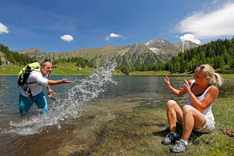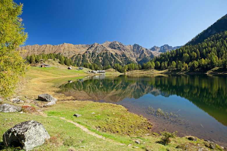 Zwei bewirtschaftete Almhütten liegen direkt am Ufer des Sees, dort werden die Gäste mit hauseigenen Produkten verwöhnt. Ein paradiesischer Ort, um die Seele baumeln zu lassen.