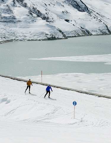 Auf bestens präparierter Strecke gleitet man – klassisch oder im Skating-Stil – auf dem zugefrorenen Silvretta-Stausee und genießt das imposante Bergpanorama der Silvrettagruppe.