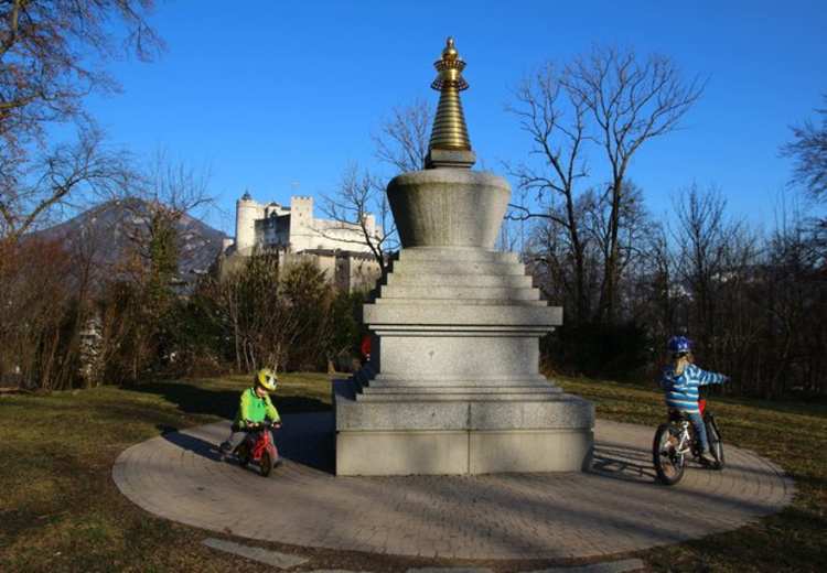 Nach ein paar Metern auf Asphalt ist endlich der Schotter erreicht. Auf leichten Wegen mit traumhaften Ausblicken über die Stadt Salzburg und zur Festung Hohensalzburg fährt man weiter bis zur buddhistischen Stupka. Ab hier geht es auf asphaltierten Wegen bergab bzw. noch einmal ganz kurz bergauf zum Schartentor. Schlussendlich gelangt man direkt zum Domplatz und ist somit wieder im Trubel der Stadt.