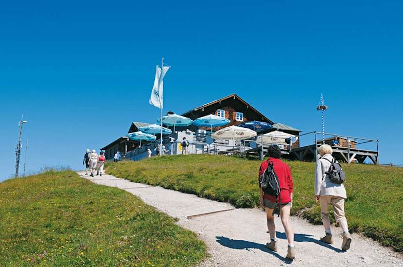 Die erste, 1929 eröffnete Wankbahn führte als Großkabinenbahn bis fast auf den höchsten Punkt, die Fundamente der Station sind noch heute zu erkennen. Also raus aus der Bergstation, links halten, dem Wegweiser „Wankhaus“ folgen und am Naturkino, einem Aussichtspunkt mit Holzbank und -hocker, vorbei zum Wankhaus. Gleich dahinter erreicht man das wunderschöne Gipfelkreuz des Wank (1.780 m).