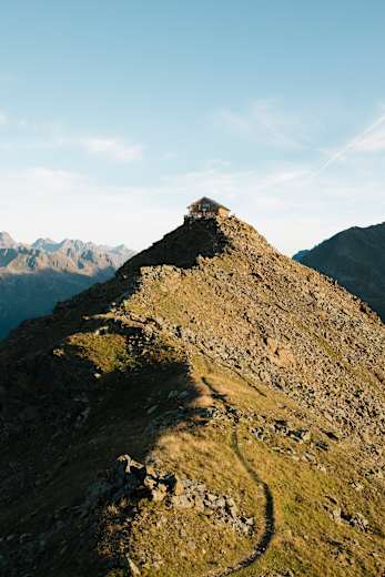 Das Brunnenkogelhaus mit Blick in die Stubaier Alpen Foto: Elias Holzknecht, Bergwelten Magazin 05/2021