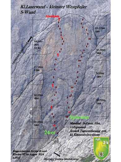 4 Seillängen führen fast senkrecht durch den Felsen aufwärts. Die Schlüsselstelle stellt die letzte Seillänge mit VII+ dar. Details siehe Topo.