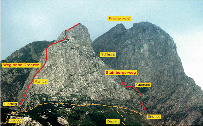Durch diesen (bis B) unter die Wände der Frischenkofel Ostwand (der Steinbergweg wendet sich hier auf einem Steiglein nach rechts). Nun links haltend im Geröll (Steigspuren) entlang des Wandfußes wenige Minuten aufwärts zum Einstieg. Oder über den schönen Oberst-Gressel-Klettersteig.