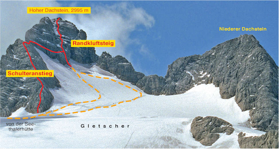 Insgesamt ca. 1 Stunde: Von der Bergstation Hunerkogel der Dachstein-Gletscherbahn in nordwestlicher und westlicher Richtung über den obersten Teil des Hallstätter-Gletschers, anfangs eben, dann leicht ansteigend entlang des ausgetretenen Gletscherpfades zur Seethalerhütte (wird auch als Dachsteinwartehütte bezeicnnet). Von dort hat man einen herrlichen Einblick in die Dachstein-Südwand. Von der Hütte westlich in wenigen Minuten zum Fußpunkt des von der Ostschulter herabführenden Nordostsporns. Hier befindet sich der Einstieg zum Schulteranstieg. Zum Randkluftsteig am Gletscher geht es nochmals 20-25 Minuten aufwärts.