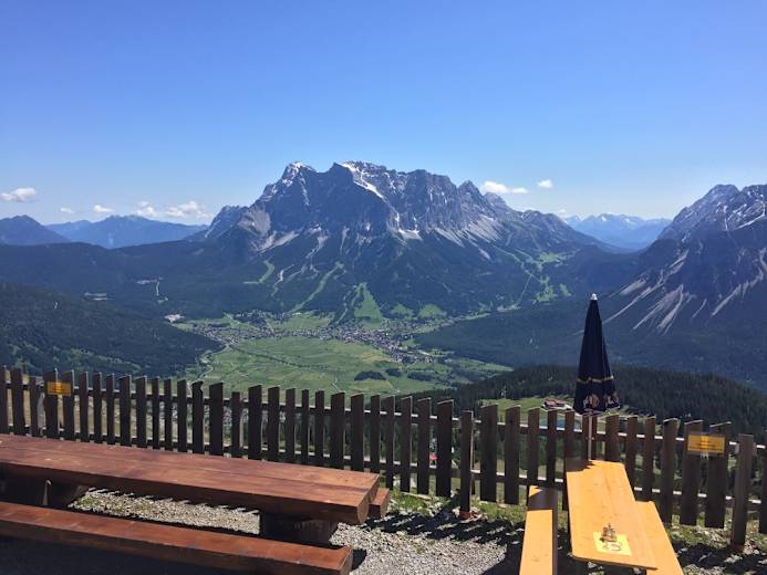Von der Talstation der Grubigsteinlifte fährt man ein Stück in Richtung Ortsmitte um dann nach rechts in Richtung Grubigalm zu fahren. Der gute Schotterweg führt immer kontinuierlich ansteigend unter den Liftanlagen bergauf. Mit jedem Höhenmeter wird die Aussicht auf das Zugspitzmassiv großartiger.