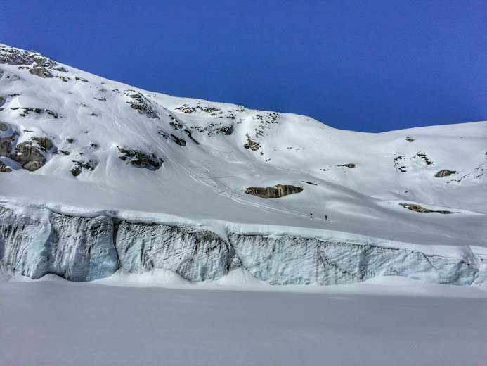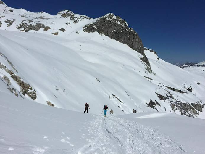 Abfahrt wie Aufstieg, bzw. über das gut einsehbare Skigelände neben der Aufstiegsspur.