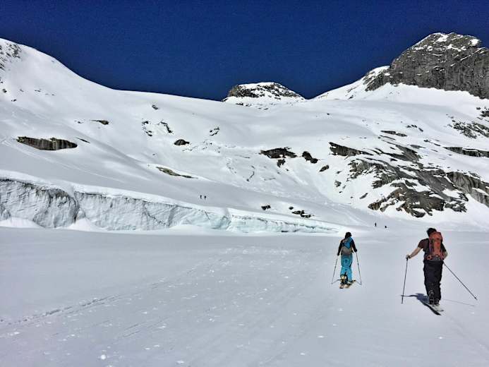 Am Dach des Kees angekommen, strebt man auf direktem Weg flach auf den gut sichtbaren Gipfel der Granatspitze zu und errichtet am linken Grat ein Skidepot.