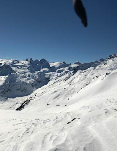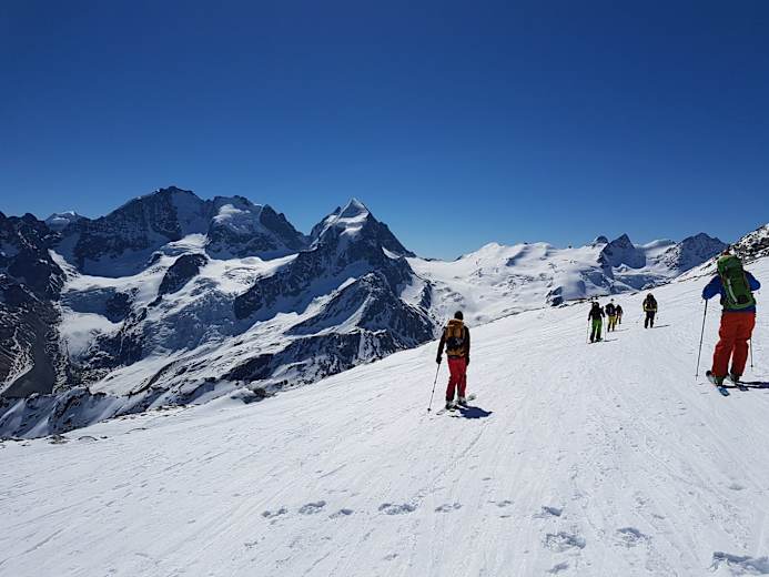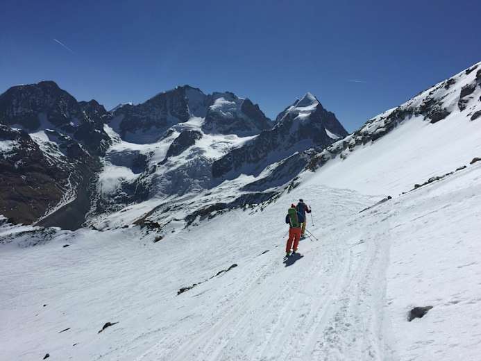 Wer nicht gleich zur Hütte abfahren möchte, kann am Anfang der Tour noch den Piz Murtel (3.442 m) oder mit einer schönen Gratüberschreitung sogar den Piz Corvatsch (3.458 m) besteigen.