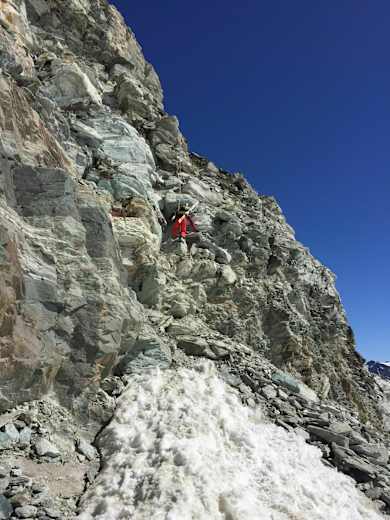 Ein Stück hinab auf der Piste, dann kurze Abfahrt über ein schräges Band. Kurze, seilgesicherte Kletterpartie durch einen Felsriegel, die mit Ski am Rücken und dem schweren Gepäck nicht zu unterschätzen ist.