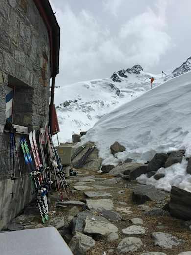 Am Ausstieg der Stufe gelangt man in ein weites Kar, durch welches man Richtung Süden abfährt bis man ungefähr auf Höhe der Hütte ist und diese mit einer langen Traverse erreicht.