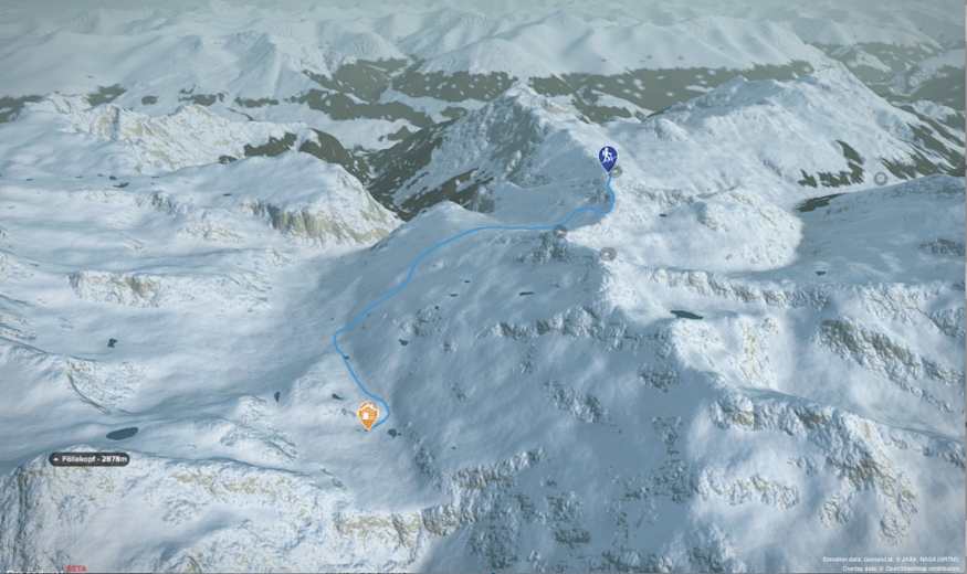 Abfahrtsvariante: Bei sicheren Verhältnissen im Gipfelbereich entlang der Aufstiegsspur, danach nach Westen durch die breite Mulde abwärts zu zwei kleineren Almhütten (2.463 m), die inmitten eines Almbodens liegen. Nun wieder Ski auffellen und in südliche Richtung auf den breiten Rücken ansteigen (zur Aufstiegsspur). Von hier entlang der Aufstiegsspur hinab zum Schlinigpass.