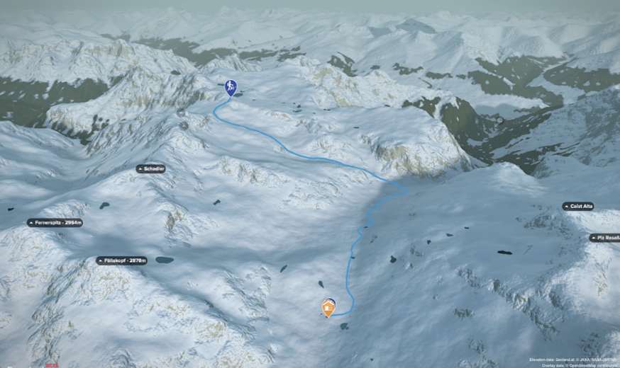 Von der Sesvennahütte steigt man nun zum Schlinigpass (2.309 m). Nun fährt man ein kleines Stück in Richtung Uinaschlucht bis zum großen Felsblock „Groß Lager“ (2.157 m) ab. Nun rechts der Bachschlucht entlang und dann links hinauf zu einem kleinen Hügel (2.280 m). Über einen kurzen Steilhang links ins Val Cristanas (2.330 m). In mäßiger Steigung immer rechts oberhalb der Schlucht weiter bis auf 2.430 m. Rechts von einer dunklen Felsformation bis auf 2.550 m und in eine Ebene hinauf.