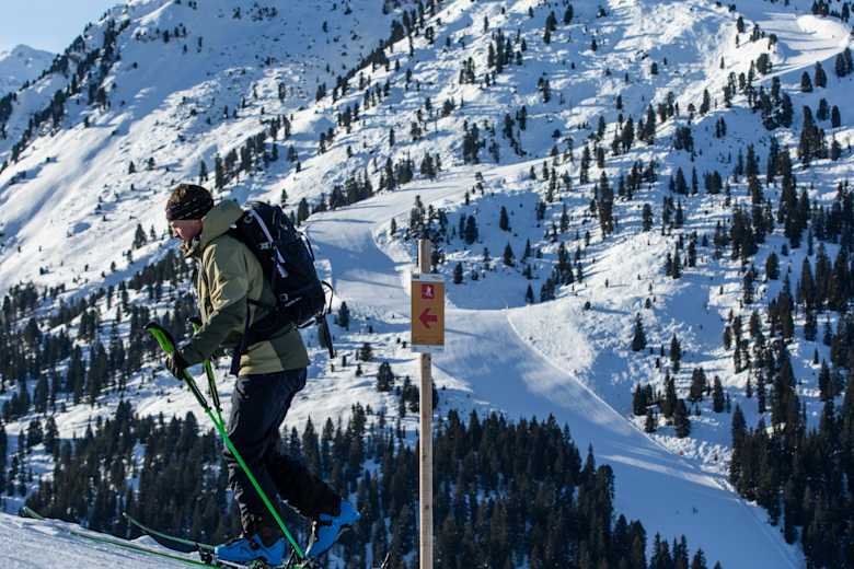 Im Skigebiet Hochfügen Zillertal in Tirol stehen zwei beschilderte Pistenskitouren zur Verfügung. Eine davon ist die Aufstiegsroute Holzalm, die bei der 6er-Sesselbahn Holzalm startet und bis zur Bergstation des Zillertal Shuttle führt.