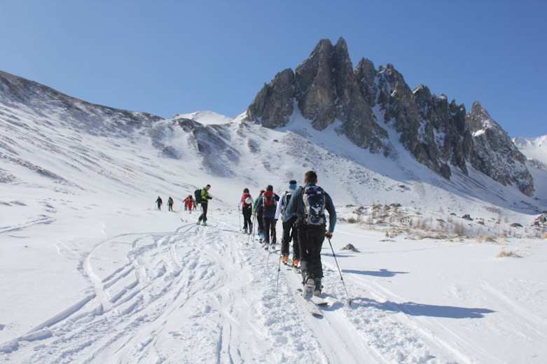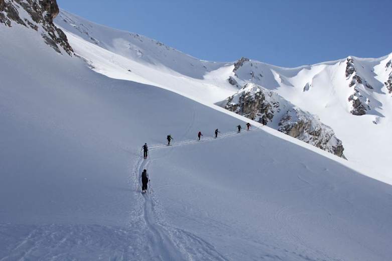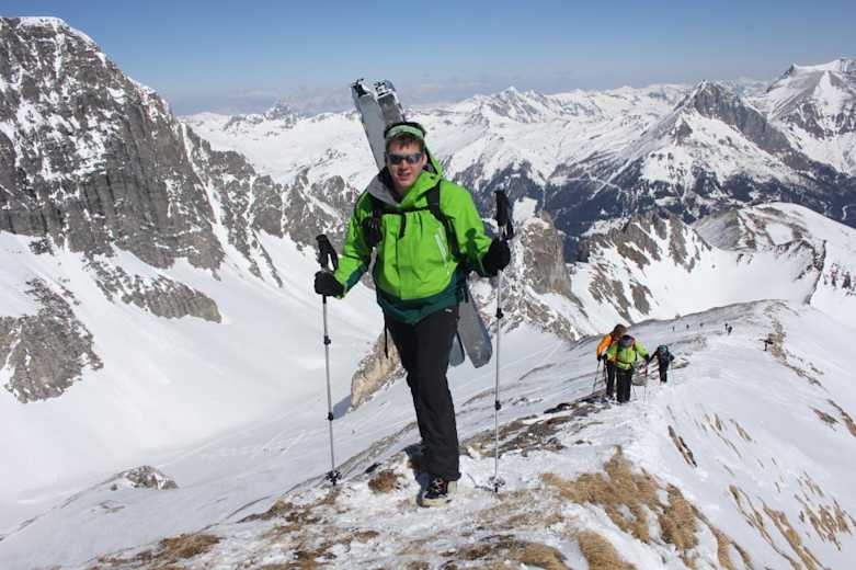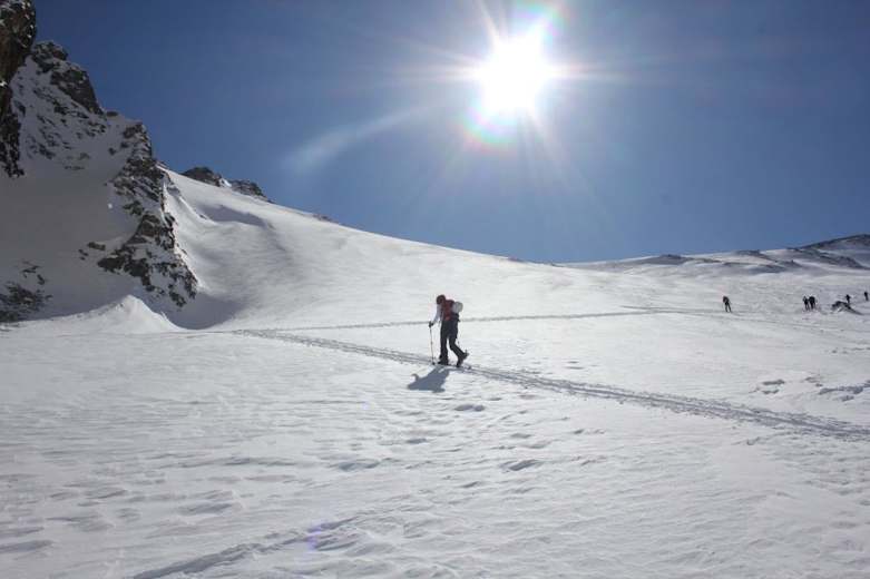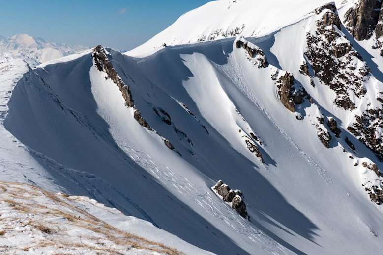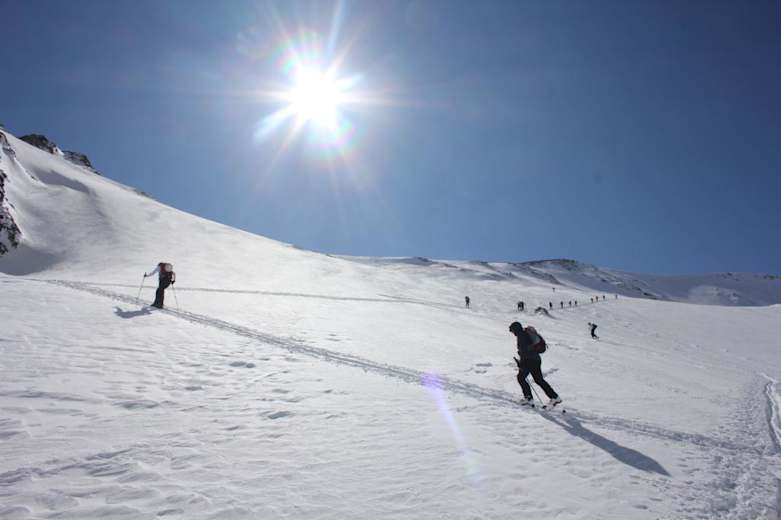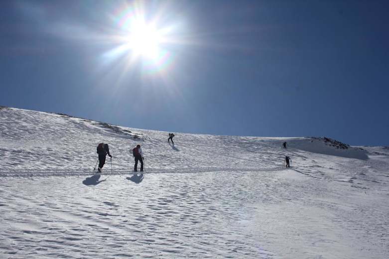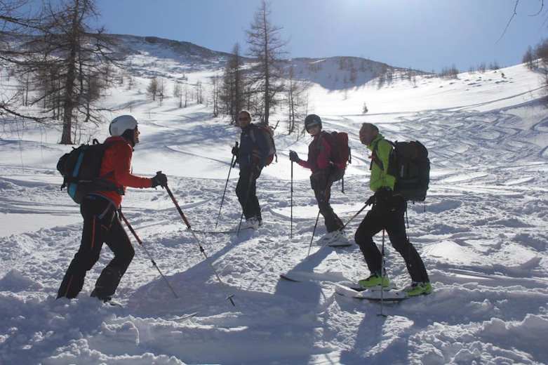 Diese Skitour eignet sich gut für die Anfahrt mit einem mitgeführten Snowboard, da keine Flachstücke oder Gegenanstiege überwunden werden müssen.