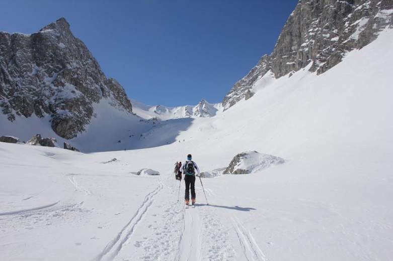 Der Felskessel öffnet sich nach links und gibt die Wegführung bis unterhalb des Sattels der Felskarspitze vor. Am Sattel mögliches Skidepot (falls man von hier aus abfahren will) oder ca. 100 m unschwieriger Aufstieg auf den Gipfel mit Ski (angeschnallt oder tragend, je nach Verhältnissen), wenn man in die dahinter liegenden Rinnen einfahren will.