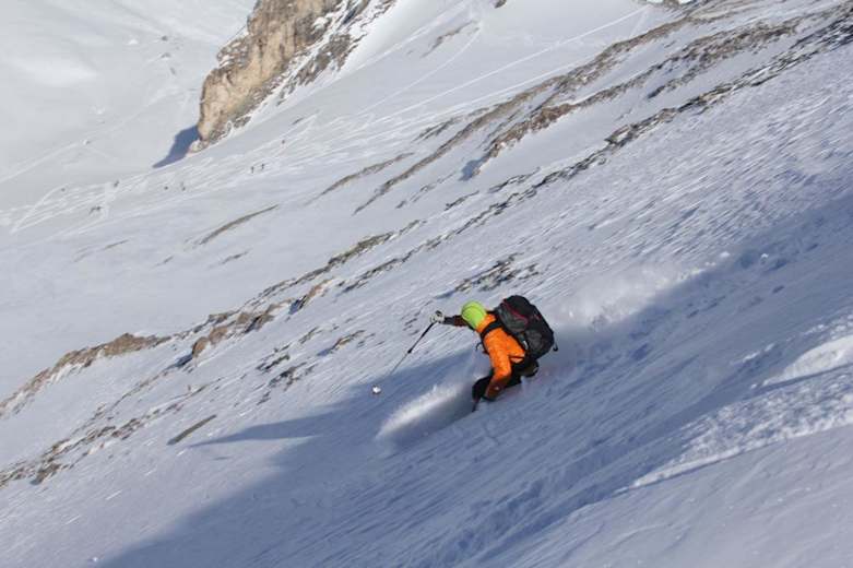 Abfahrt durch die erste Rinne westlich des Gipfels