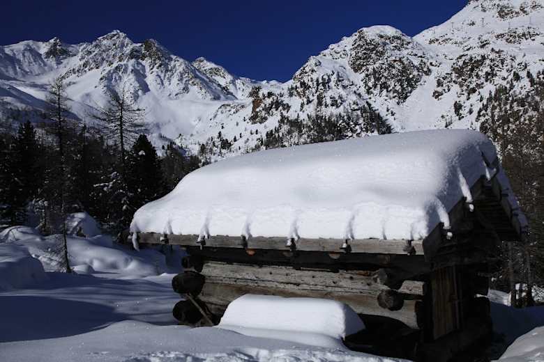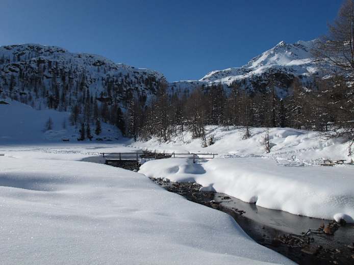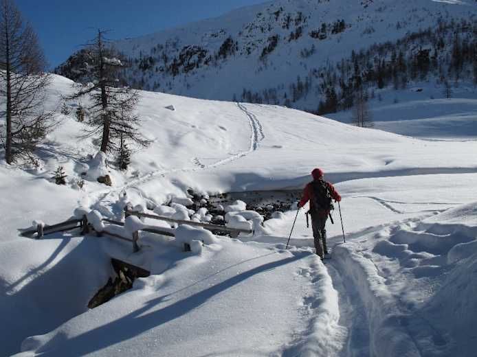 Eine Traumroute führt hinauf zum Gipfelsteinmann, durch lichten Lärchen- und Zirbenwald mit großen Felsblöcken und alten Wurzelstöcken, die mit einer dicken Schneehaube bedeckt sind, und vorbei an alten Almhütten. Wir überqueren die weite Schwemmebene des Falschauer Bachs und insgesamt fünf Brücken, wenn wir dem Fischersee, der etwas abseits unseres Weges unter einer dicken Eis- und Schneeschicht liegt, noch einen Besuch abstatten. Nach der Oberen Weißbrunnalm trennt sich unsere Spur von der Skiroute, die sich in das steile Kar „In den Wänden“ verabschiedet, während wir über schöne Mulden und einen letzten Aufschwung unserem Gipfel zustreben.