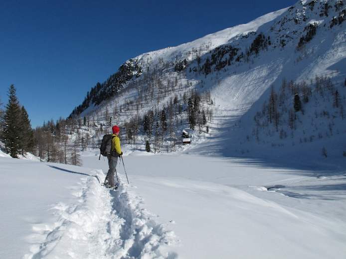 Im Abstieg können wir bei guten Schneeverhältnissen vom Gipfel direkt zur Alm hinunterlaufen, dann folgen wir unserer Aufstiegsspur bergab zum Beginn der Schwemmebene.