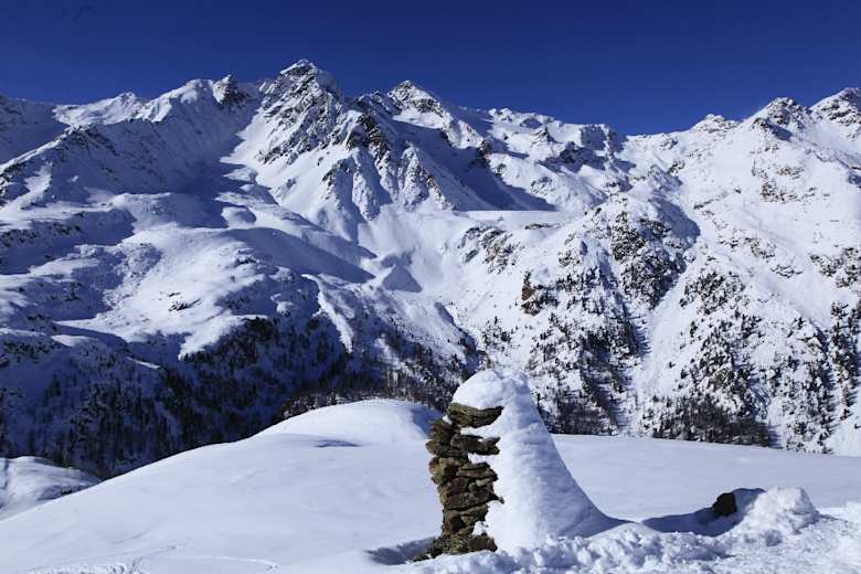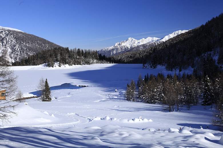 Bilderbuchlandschaft mit alpinem Flair auf 2.381 m in den Ortler Alpen: Im hintersten Ultental, hoch über dem Weißbrunnsee, bilden die Dreitausender Eggenspitze und Zufrittspitze mit ihren felsigen Steilflanken einen hochalpinen Talabschluss. Vor dieser eindrucksvollen Kulisse hat die Natur einen idealen Schneeschuhberg in der autonomen Region Trentino-Südtirol platziert: den Schmelzbichl. Von seinem Gipfel begeistern uns vor allem die Nahblicke ins Hochgebirge.