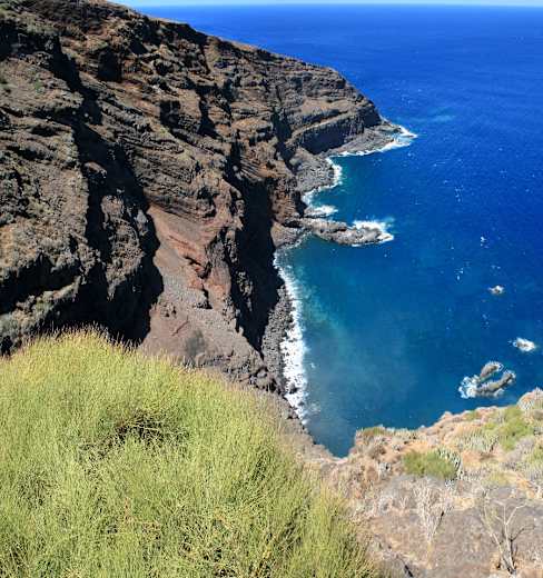 Von Buracas zur Punta de Hiscaguán (¾ Std.): Vorbei an den Höhlen/Petroglyphen setzt sich der weiß-rot markierte Camino fort. Er passiert ein Höhlenhaus (hier an Gabelung links) und mündet nach 10 Min. in eine Piste. Auf dieser links, in weitem Rechtsbogen, hinab zu einem einsamen Gehöft (20 Min.; Abkürzungsmöglichkeit auf Pfad). Links, entlang der Abbruchkante zum Barranco de Izcagua (Vorsicht!), setzt sich ein Pfad fort.
