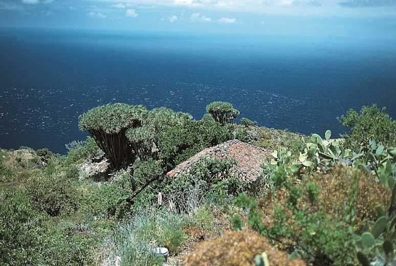 Nach knapp 15 Minuten verzweigt sie sich 10 m vor einem Wasserreservoir – hier halb rechts weiter zu den Drachenbäumen im Talgrund, zwischen denen ein schöner Pfad weiterführt. An der nächsten Verzweigung halten wir uns links bergab (weiß-rot durchgestrichen) und sogleich wieder auf dem Pfad nach rechts (anschließend beim Café Finca Aloe geradeaus). Er bringt uns in wenigen Minuten zu den Cuevas de Buracas, 400 m.