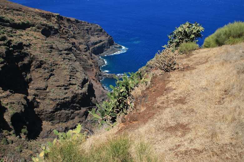 Er durchschreitet sogleich ein Gatter und führt durch einen wildromantischen Landstrich mit riesigen, wenigstens 3 m hohen Feigenkaktus-Bäumen. Nach gut ¼ Std. sollte man sich links hinüber zu einem schwach ausgeprägten Felssporn halten, von dem man einen großartigen Blick zur Steilküste genießt.