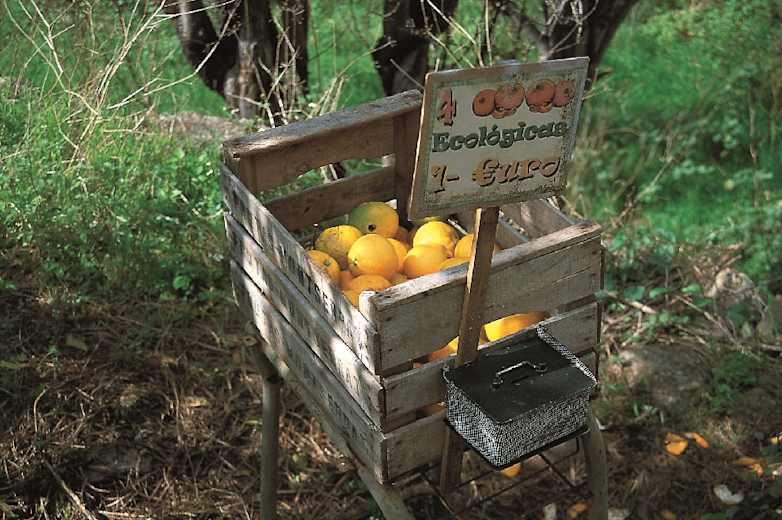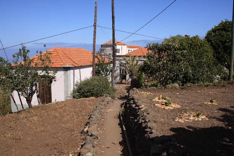 10 m vor der Kirche zweigt von der Hauptstraße links abwärts ein Betonsträßchen ab (Infotafel), von dem nach 40 m links ein Camino zum nächsten Bergrücken hinüberführt. Über diesen wandern wir gemütlich hinab, vorbei an hübschen Häuschen und Gärten. Nach 5 Minuten erreichen wir eine Wegkreuzung – hier rechts mit dem GR 130 (weiß-rot) hinüber zur nahen Hauptstraße und auf dieser weiter hinab. Nach 5 Minuten, 50 m nach der Straßenverengung, zweigt in der scharfen Rechtskurve geradeaus der GR 130 auf einen breiten Pflasterweg ab (nach 100 m links, gleich darauf rechts auf breitem Pfad "R.T. Traviesa").