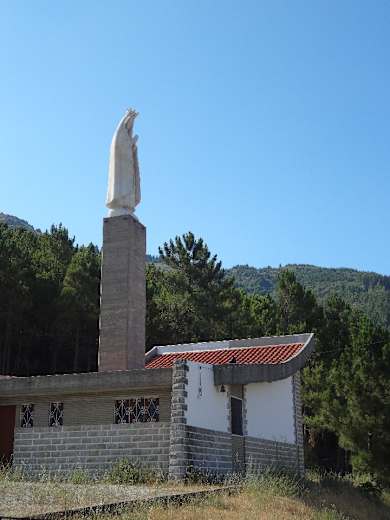 Dann überqueren wir einen Bachlauf und erreichen wenig später die ersten Häuser von Manteigas. Nach einer Häuersiedlung zweigen wir nach rechts ab und gehen einen steilen und gepflasterten Straßenweg bergab. Aus dem gepflasterten Weg wird bald ein Pfad, der in eine Straße einmündet. Auf dieser gehen wird geradewegs auf die Kapelle Sâo Domingos zu, die einen Turm mit einer Marienstatue darauf hat. Von hier aus bietet sich noch einmal ein schöner Blick auf das Ortszentrum von Manteigas.