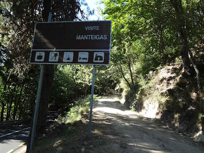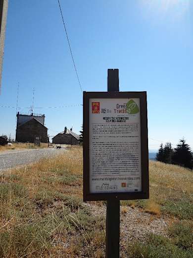 Nach rund 15 Min. erreichen wir wieder eine Asphaltstraße, der wir rund 400 m nach rechts folgen. Wir passieren ein Holzhaus sowie einen Brunnen (in einer Kurve). Bei dem Schild „Visite Manteigas“ verlassen wir die Asphaltstraße nach links und gehen auf einer Sandpiste in weiten Serpentinen durch einen Eichen- und später Fichtenwald bergan. Bei der nächsten Wegekreuzung folgen wir weiterhin dem PR-4 nach links und erreichen kurz danach die meteorologische Station Observatório Metereológico das Penhas Douradas.