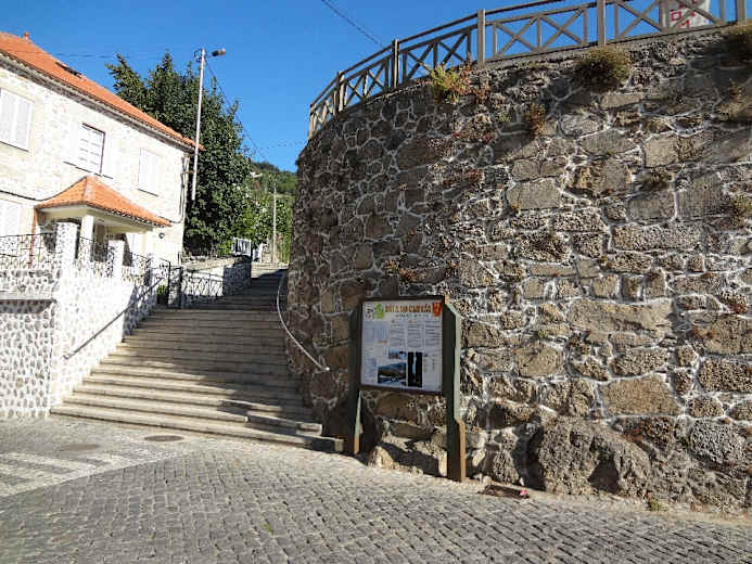 Die Informationstafel zum Weg ist gegenüber dem Rathaus und dem Gemeindearchiv von Manteigas angebracht. Wir gehen von der „Vista panorâmica“ aus zunächst die Rua Dr. Sobral bergan, steigen Treppen hoch und kommen bei der Casa da Misericórdia vorbei, die rechts des Weges liegt. Danach biegen wir nach rechts und wenig später nach links ab und gehen die Straße hinauf.
