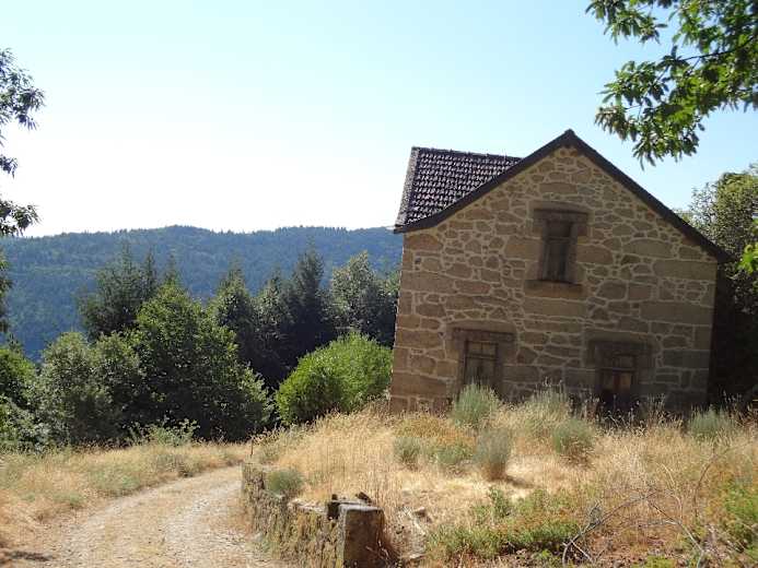 Hier folgen wir der Markierung, die Manteigas mit 5 km ausweist. Nun liegt ein gemütlicher Waldweg vor uns, der zumeist leicht bergab und im Schatten von Kiefern verläuft. Wir kommen rechts an einem verfallenen Haus vorbei, danach wird der Abstieg nochmals etwas steiler. Bei der Wegkreuzung nach einem weiteren verfallenen Haus gehen wir geradeaus.