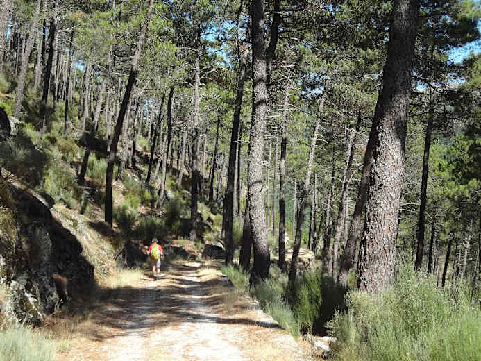 Nach diesem sehr mühsamen Abstieg wird der Weg etwas einfacher, und wir erreichen bereits die ersten Kiefern. Schon bald geht der schmale Pfad in einen breiten und schönen Waldweg über.