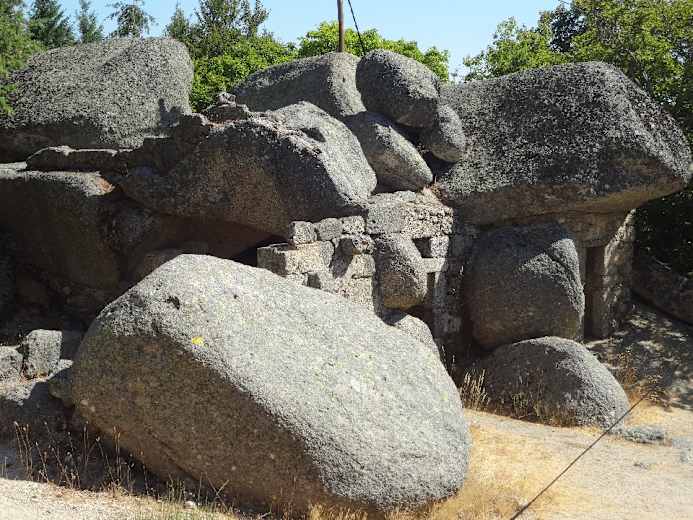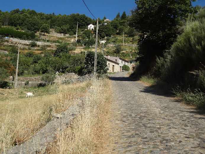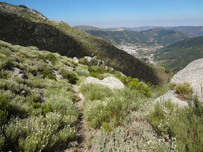 Hier folgen wir der Asphaltstraße nach links. Kurze Zeit später zweigt unser Weg von dieser nach links ab und steigt als schmaler Pfad durch einen Wald bergan zu den Casas da Fraga, Häuser, die unter große Granitfelsen aus Bruchsteinen errichtet wurden. Wir folgen der Asphaltstraße nach links und wandern an der kleinen Feriensiedlung Penhas Douradas vorbei. Gegenüber von einem braunen Holzhaus führt ein Stichweg nach links zum „Miradouro Penhas Douradas“, der auf 1.475 m liegt und einen schönen Ausblick auf die Serra da Estrela eröffnet.