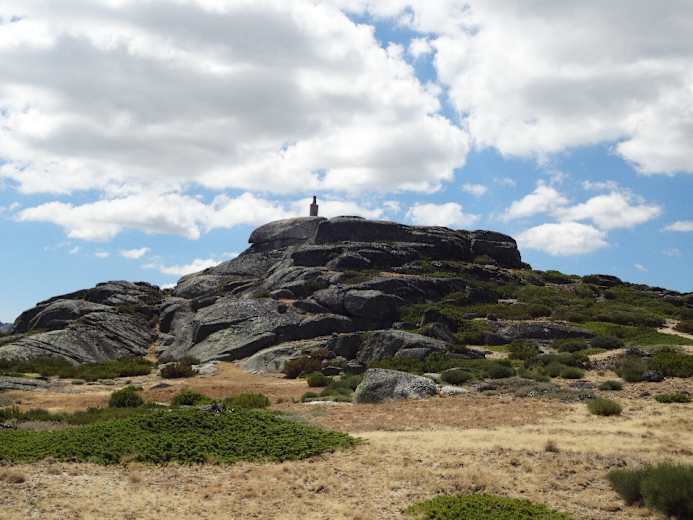 Schließlich macht der Weg eine weite Linkskurve, und wir erreichen eine weitere Hügelkuppe, wo wir mit einem kleinen Abstecher auf den Curral do Martins aufsteigen, einen Vermessungspunkt auf 1721 m. Nach dem Abstecher beginnt sich der Weg leicht in Richtung Gletschertal des Rio Zêzere zu drehen. Die Markierungen sind hier etwas schwieriger zu sehen, werden aber durch Steinmännchen ergänzt.