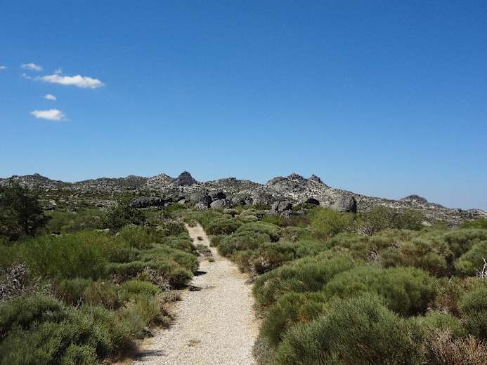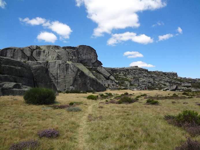 Wir wandern auf der eindrucksvollen Hochebene, die von zahlreichen, zum Teil sehr fantasievoll geformten Granitfelsen übersät ist. Zwischen den Felsen sind manchmal Steinhäuser errichtet, die als Ställe oder Scheunen verwendet werden. Ein leichter Anstieg bietet einen weiten Blick nach rechts zum Stausee und in das Valle de Rossim. Bald geht der Weg in eine Sandpiste über, und wir zweigen bei einer Holztafel, die in Richtung „Nave da Mestra“ verweist, von der breiten Sandpiste auf einen schmaleren Pfad ab.