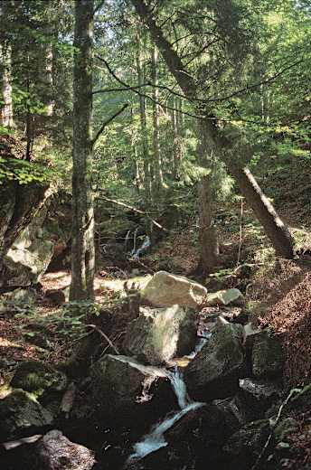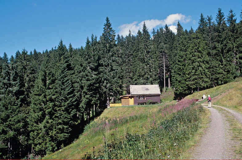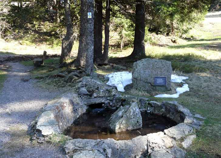 Wer mit dem Bus nach Todtnau zurückfahren will, geht rechts hinauf zum Hebelhof, während der mit der gelben Raute markierte Feldbergpfad links weiterführt: Unterhalb der Quelle führt ein Forstweg links in den Wald hinein, wo wiederum nach wenigen Metern der Feldbergpfad/Hebelweg rechts auf einen für Fahrräder gesperrten Pfad wechselt.