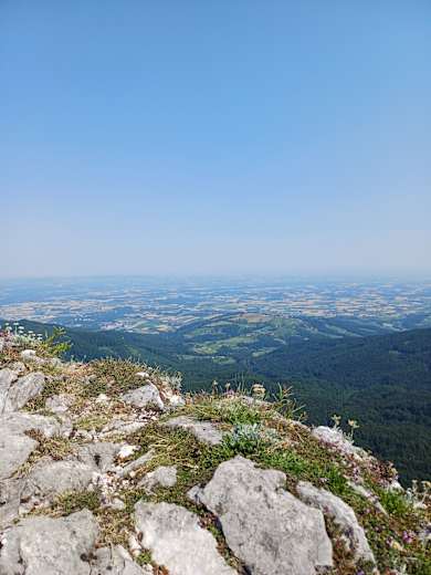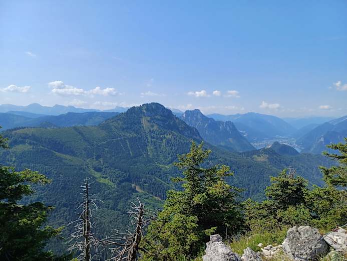 Vom Gipfel wandert man entlang des Grates weiter Richtung Westen und erriet den Durchgang. An der Weggabelung hält man sich nun rechts und wandert durch den Hauergraben abwärts. Rund 500 m nach dem Parkplatz folgt man der Straße rechts zu einem alten Bauernhaus und wandert dort entlang eines schönen Wanderweges hinunter nach Almen. Das letzte Stück wandert man entlang der asphaltierten Straße retour zum Bahnhof von Grünau im Almtal.