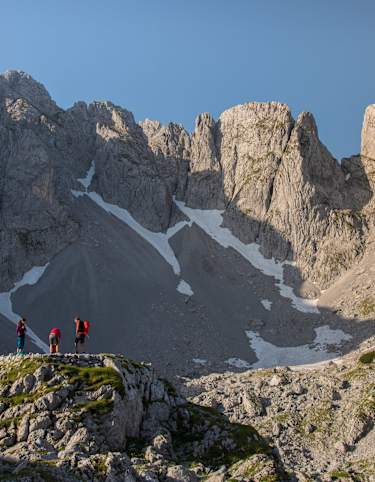 Wir starten zum Aufwärmen mit einer nahezu waagrechten Querung unterhalb der Hochthron Südwestwand zum Beginn der Hochthronleiter. Die anfangs senkrechte Leiter führt uns ausgesetzt ins Throntal zwischen Gr. Fieberhorn und Hochthron. Anfangs versichert – Achtung auf lose Steine – und später über Geröllfelder und einen zunehmend grasdurchsetzten Felssteig gewinnen wir rasch an Höhe.