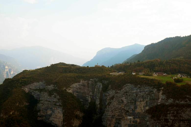 Anschließend geht es zuerst bergab ins bewaldete Tal und schließlich durch dichten Wald wieder bergauf zum Gipfel des Dos dei Nozi, wo die Kirche aus dem 14. Jahrhundert mit kleinem angeschlossenen Friedhof steht.