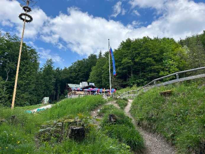 Kurz unterhalb des Grünsteinsattels treffen beide Wege zusammen und führen hinauf zur Grünsteinhütte (1.220 m).
