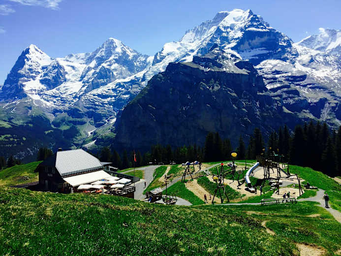 Die ideale Familienwanderung in der Jungfrau Region, die auch mit dem Kinderwagen bewältigt werden kann: In einer knappen Stunde erreicht man von Mürren (1.638 m) den Allmendhubel (1.909 m), wo sich die Kleinen auf dem Abenteuerspielplatz austoben können. Alle anderen geniessen den Blick auf das Berner-Alpen-Dreigestirn Eiger, Mönch und Jungfrau, das zum Greifen nah scheint.