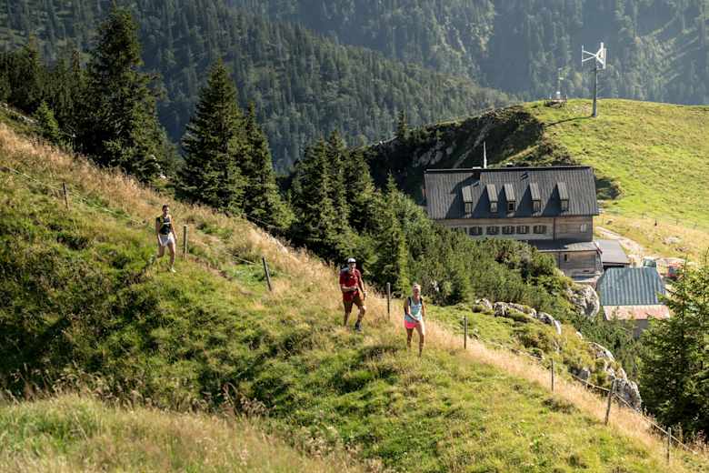 Die Wanderung von der Bergstation der Taubensteinbahn in der Alpenregion Tegernsee Schliersee in Bayern zum Rotwandhaus auf 1.737 m ist geprägt von der wunderbaren Aussicht auf die Gipfel der Bayerischen Voralpen.