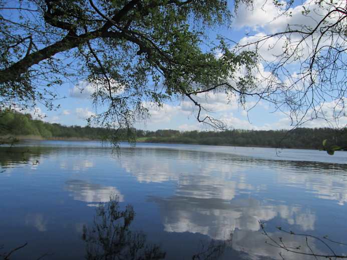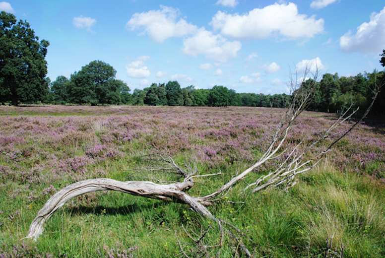 Man folgt dem Rundweg nach rechts und wandert durch das Naturschutzgebiet vorbei an vielen kleinen Kanälen. Danach erreicht man eine schöne Heidelandschaft mit vielen tollen, alten Bäumen. Durch ein Gatter geht man fast direkt bis an das Heilige Meer heran und genießt einen wunderschönen Ausblick über den See.