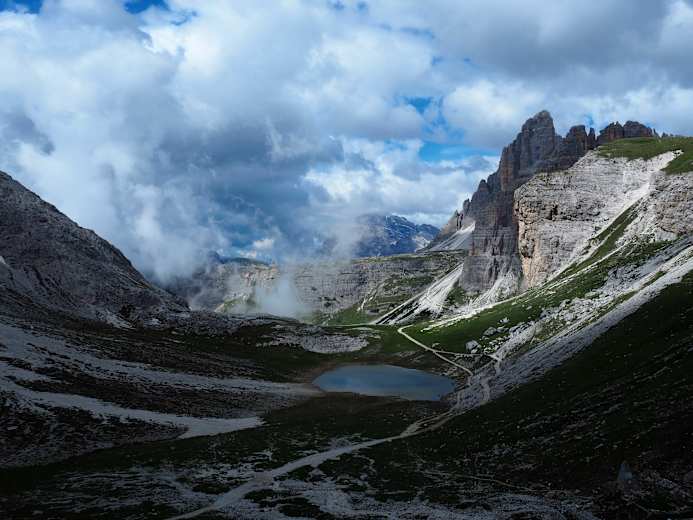 Ab hier wird der Weg landschaftlich noch einmal besonders schön. Es geht nach rechts weiter und über den Weg Nr. 104 bergan über eine Schulter an den Lavaredo-Seen vorbei. Im Anschluss geht es abwärts südlich des Passportenkofels und des Paternkofels vorbei hinunter zum tiefsten Punkt der Tour, den Piani di Cengia.