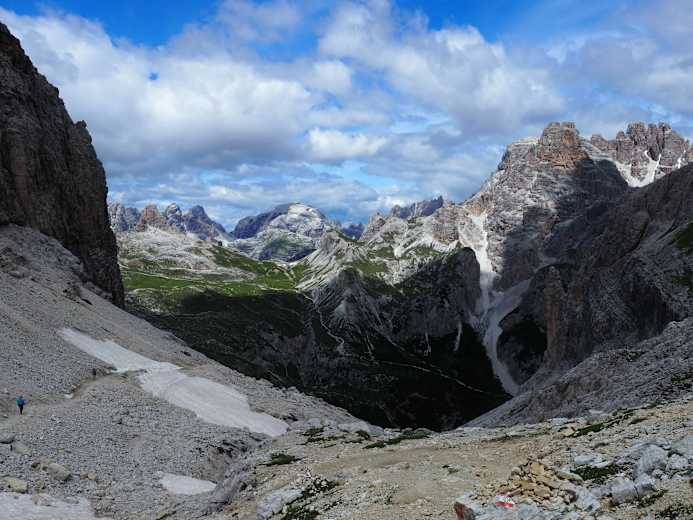 Vom Joch wandert man abwärts an der Nordflanke des Paternkofels nach Westen. Auf schmalem Steig geht es entlang der Schuttflächen weiter und nach einem kleinen Gegenanstieg gelangt man zur Drei-Zinnen-Hütte mit fantastischem Blick auf die Drei Zinnen.