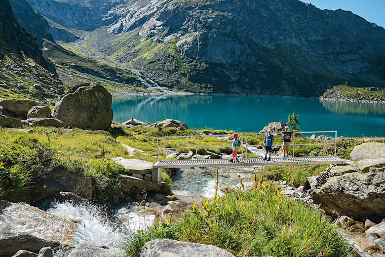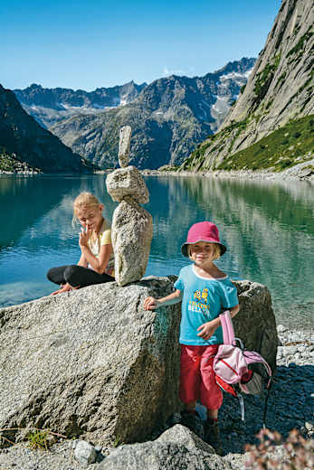 Bei der Rundwanderung um den Gelmersee genießt man die hochalpine Bergwelt, ursprüngliche Bachläufe und riesige Felsplatten sowie natürlich den türkisblauen See. Auch für ältere Kinder geeignet, wenn sie über Trittsicherheit und Schwindelfreiheit verfügen.
