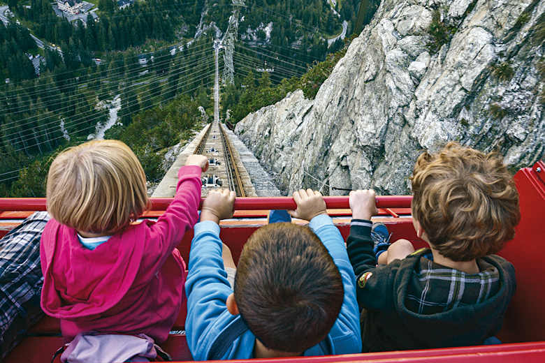 Bei einer maximalen Steigung von 106 Prozent – das entspricht einer Neigung von knapp 47 Grad – kann das für manch einen eine schaurige Sache sein. Bei der Fahrt haben alle Kinder einen Riesenspaß, während einige Erwachsene einen weitaus weniger entspannten Eindruck machen.