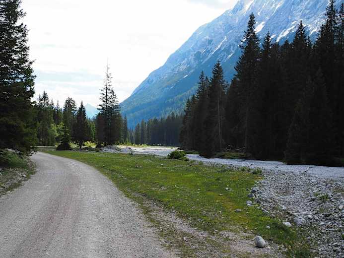 Vom Parkplatz Salzbach folgt man dem Weg Nr. 41, dem Ganghoferweg, taleinwärts. Der anfangs breite Weg verläuft parallel zum Fostweg, der auch gerne von Mountainbikern genutzt wird. Bald schon zweigt man - immer noch auf dem Ganghoferweg - rechts ab und wandert nun auf einem gemütlichen Steig leicht ansteigend durch lichten Bergwald bis zur Gaistalalm auf 1.366 m. Die Alm selbst steht auf einer sonnigen Almwiese, umgeben von einigen Bäumen, im Hintergrund die Gipfel des Wetterstein- und Zugspitzmassives.