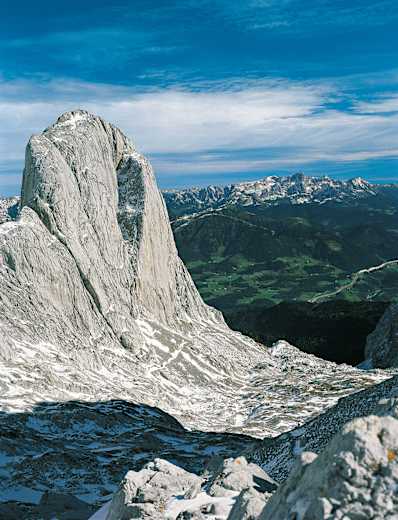 Halber Weg zum Hochkönig: Torsäule über dem Ochsenkar, hinten der Dachstein. Foto: Rother Bergverlag - Sepp Brandl