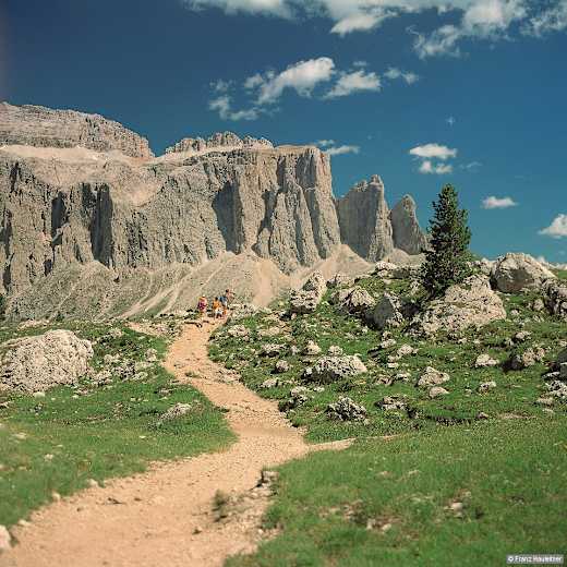 Auf Weg Nr. 526 unterhalb der Langkofel-Ostwand über Wiesen nach Süden sanft aufwärts, später durch die „Steinerne Stadt“ (Bergsturzzone mit hausgroßen Felsblöcken) und weiter zum Sellajochhaus. Auf bekanntem Weg zurück zur Rodellabahn-Bergstation.